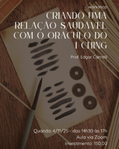 Tendo como princípio transmitir o máximo da experiência do Prof. Edgar Cantelli, nessa relação com o oráculo, teremos esse workshop, dia 4 de novembro de 2025, das 14h30 às 17h, via Zoom. Ele é voltado para todos os interessados na prática oracular do I Ching, iniciantes ou experientes.